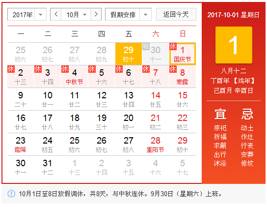2017年10月1日(星期日)至2017年10月8日(星期日)調(diào)休放假共8天,其中9月30日(星期六)調(diào)休上班,10月9日(星期一)開(kāi)始正常上班。