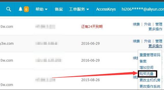 購買方法:例如購買50G或100G流量,必須是50G的整數倍。登錄后臺,到虛擬主機中,點業務后面的:更多操作,如下圖: