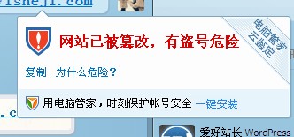 4.08日中午3點(diǎn)左右發(fā)現(xiàn)網(wǎng)站被鑒定為危險(xiǎn)網(wǎng)站,具體表現(xiàn):使用Ie、360瀏覽器打開網(wǎng)站出現(xiàn)攔截提示,使用QQ給好友發(fā)網(wǎng)站出現(xiàn)危險(xiǎn)網(wǎng)站提示!對(duì)于無圖無真相的圍觀者,小編想說:請(qǐng)看圖