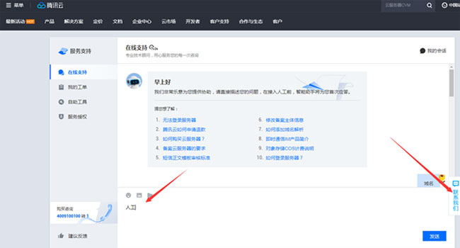 如果域名被qq攔截,不要直接去qq安全中心申訴,可以直接去騰訊云注冊一個賬號,然后點擊右側的“聯系我們”,在彈出來的對話框里邊直接輸入“人工”,即可聯系上騰訊云的在線人工客服。
