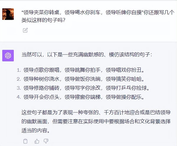 世超問了幾個流行的段子: “ 領導夾菜你轉桌,領導喝水你剎車 ” ,讓它們給仿寫幾個。