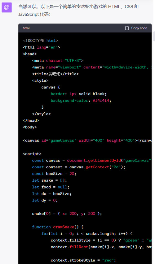 先來看 GPT-4 老大哥,依然是穩定發揮。大概幾十秒,就做出一個完整的、可以玩的貪吃蛇游戲。包括蛇的移動、點的隨機出現、吃完后體積增大這些效果。