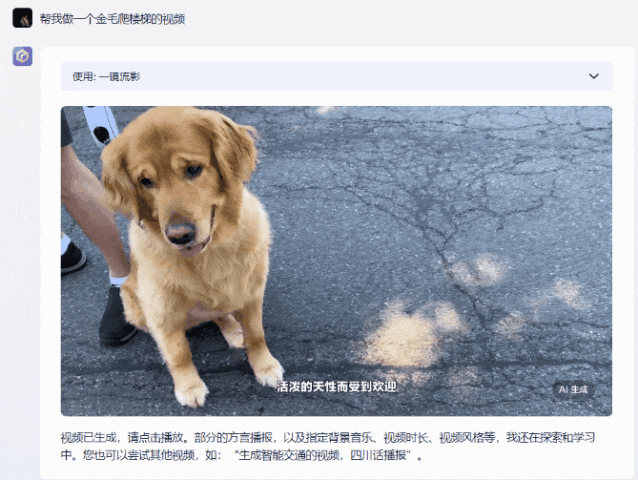 比如說一句話做一個金毛爬樓梯的視頻,幾分鐘之后一條配好音的視頻就做好了。
